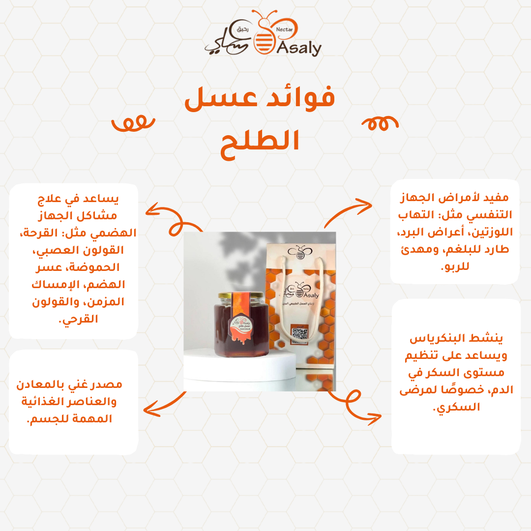 عسل طلح اصلي نجدي طبيعي 100% من إنتاج محافظة حريملاء، تحت إشراف وعناية مباشرة من النحال. يتميز بجودته العالية وطعمه الفاخر وقيمته الغذائية، ويُعد من أفضل أنواع العسل لما له من فوائد صحية متعددة.
